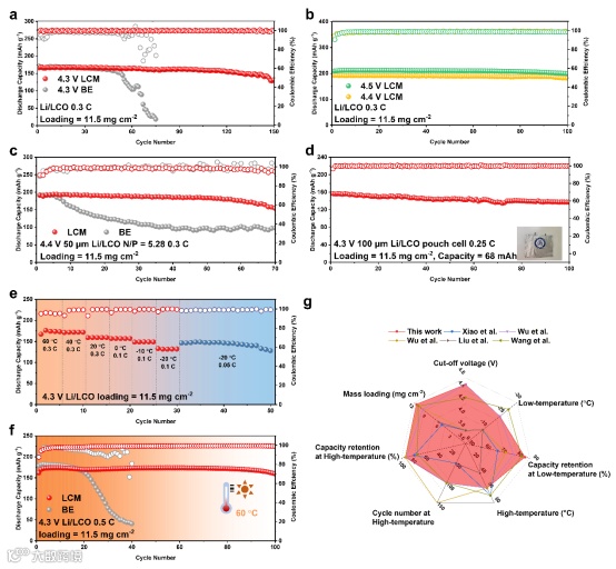图5 (a)Li/LCO全电池在4.3 V,0.3 C条件下的循环性能。(b)Li/LCO全电池在4.4 V和4.5 V,0.3 C条件下的循环性能。(c)Li/LCO全电池在N/P=5.28的条件下的循环性能。(d)容量为68 mAh的Li|LCM|LCO软包电池在0.25 C条件下的循环性能。(e)Li|LCM|LCO电池在-20 °C到60 °C温度范围下的电化学性能。(f)Li/LCO全电池在60 °C条件下的循环性能。(g)LCM组装的电池与最近报道的锂金属电池性能对比雷达图