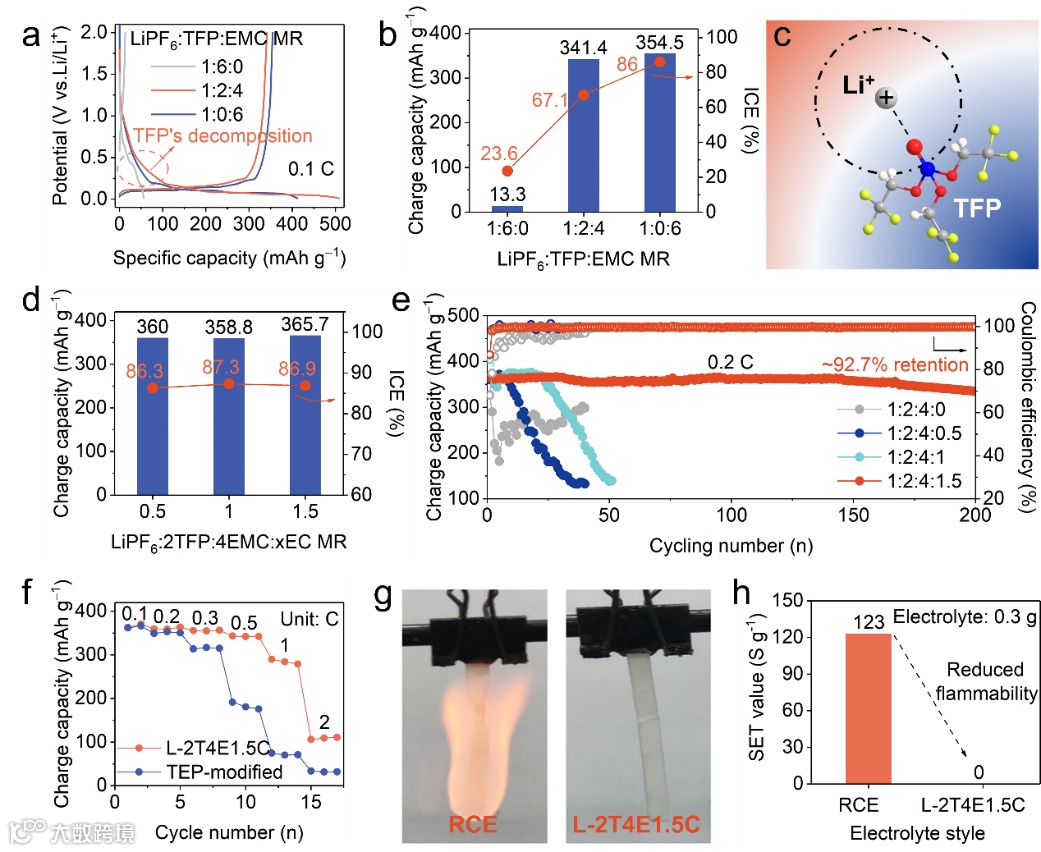 图 3:(a, b)电解液与负极兼容性评估。(c)TFP与Li+作用模型。(d,e) 加入EC后的电解液与负极兼容性评估。(f)TFP与TEP基电解液中石墨负极性能对比。(g,h)所设计电解液阻燃性测试