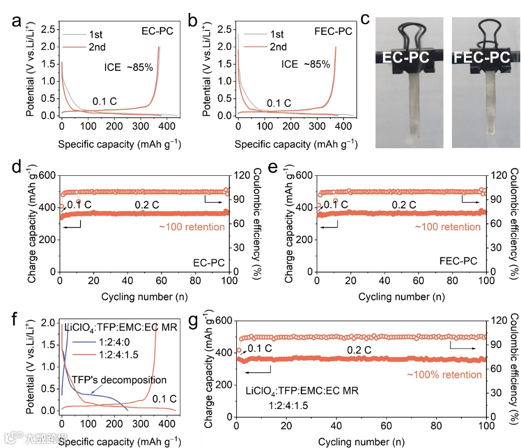 图 4:(a,b) PC和FEC替换EC后电解液与石墨负极的兼容性。(c)电解液的阻燃性。(d,e)在PC和FEC体系中石墨负极的循环表现。(f,g)高氯酸锂电解液体系石墨负极表现。