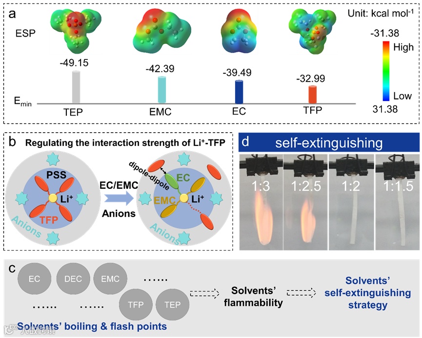 图 2:(a)溶剂分子静电势。(b) 溶剂-阴离子协同调控设计理念。(c) 基于溶剂沸点和闪点提出的混合溶剂自熄灭策略。(d) 利用自熄灭策略确定溶剂基本组成。