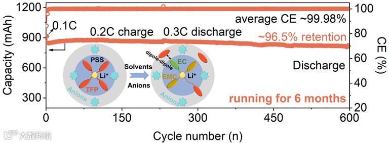在石墨-三元软包电池中验证了溶剂-阴离子这种多级调控策略的有效性,软包电池小电流下循环600圈后容量保持率高达96.5%,循环中平均库伦效率99.98%,且无明显产气行为,长达半年的日历寿命优于文献报道的含阻燃电解液的电池表现。