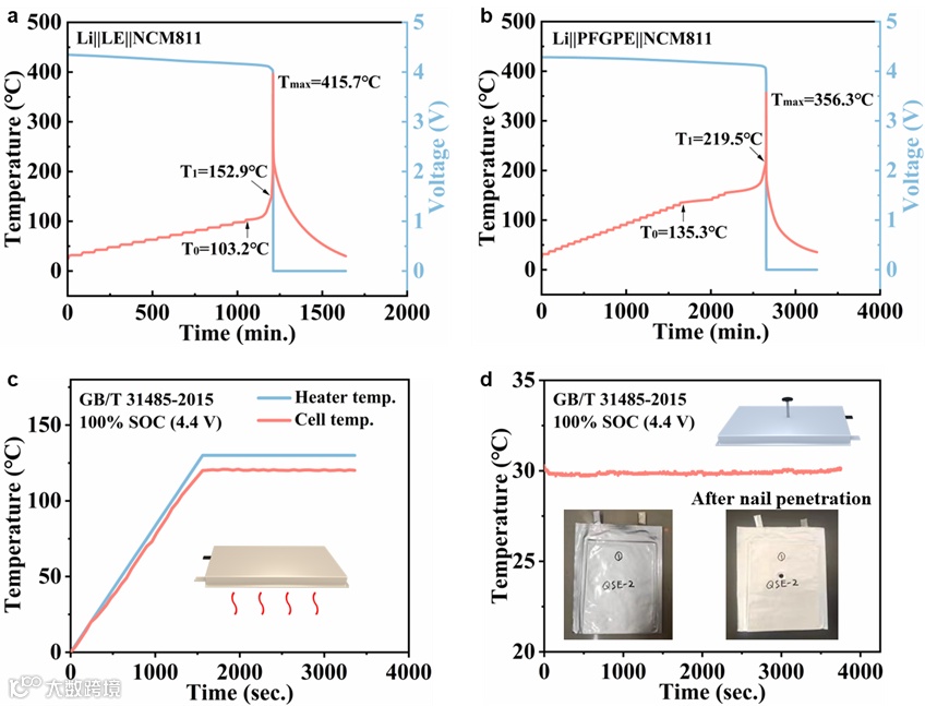 采用PFGPE的实用软包电池表现出优异的热安全性,并成功通过机械钉穿透和热滥用的国际标准测试。