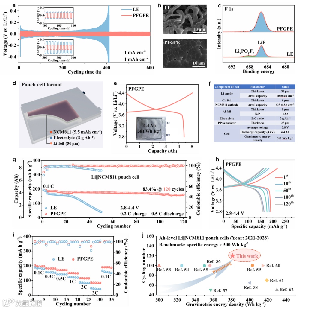 图4 (a) 采用PFGPE和LE的Li||Li对称电池的电压曲线。(b) LE和PFGPE的锂沉积形貌。(c)不同电解液中Li金属上SEI的F 1s XPS谱。(d) Li||NCM811软包电池示意图。(e) 采用PFGPE的Li||NCM811软包电池的初始充电和放电曲线。(f) 采用PFGPE的Li||NCM811软包电池的电池参数。(g) 采用LE和PFGPE的Li||NCM811软包电池的循环性能。(h) 使用PFGPE的Li||NCM811软包电池的循环充电和放电曲线。(i) 采用LE和PFGPE的Li||NCM811软包电池的倍率性能。(j) Ah级Li|| NCM811软包电池性能对比最近的报告(2021年至2023年,能量密度超过300 Wh kg−1)