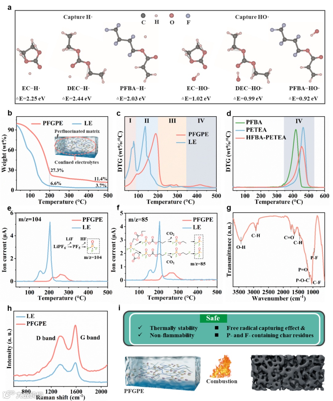 图3 (a) EC-H·、DEC-H·、PFBA-H·、EC-HO·、DEC-HO·和PFBA-HO·的相对能量和优化结构(A和B)的DFT计算。(b) 在10°C min-1的加热速率下,LE和PFGPE在N2流下的TGA曲线。(c) LE和PFGPE的 DTG 曲线。(d) 不同聚合物基质的 DTG 曲线。m/z 在 (e) 104 和 (f) 85 处的典型热解产物。(g) PFGPE 炭残留物的 FTIR 曲线。(h) LE和PFGPE残炭的拉曼分析。(i) PFGPE阻燃行为的示意图