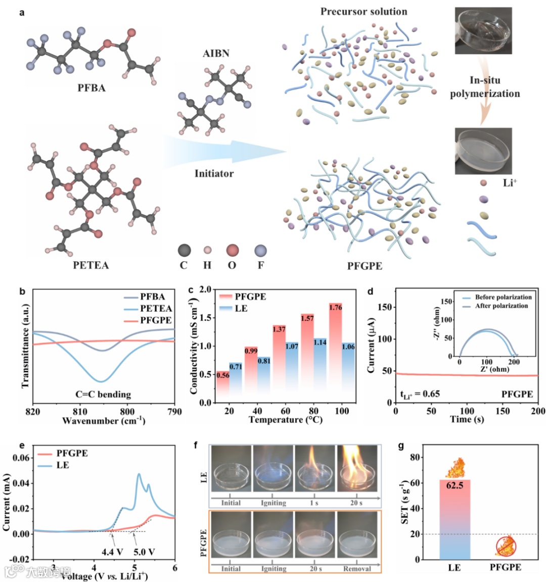 图2 (a) PFGPE原位聚合的示意图以及前体溶液和PFGPE的光学图像。(b) PFBA、PETEA和PFGPE的FTIR光谱。(c) 离子电导率与LE和PFGPE温度的关系。(d) 在10 mV的极化电压下具有PFGPE的Li||Li对称电池的计时电流分析图和极化前后的相应EIS谱(插图)。(e) LE和PFGPE在1 mV s−1扫描速率下的线性扫描伏安曲线。(f) LE和PFGPE的燃烧试验。(g) LE和PFGPE的SET值