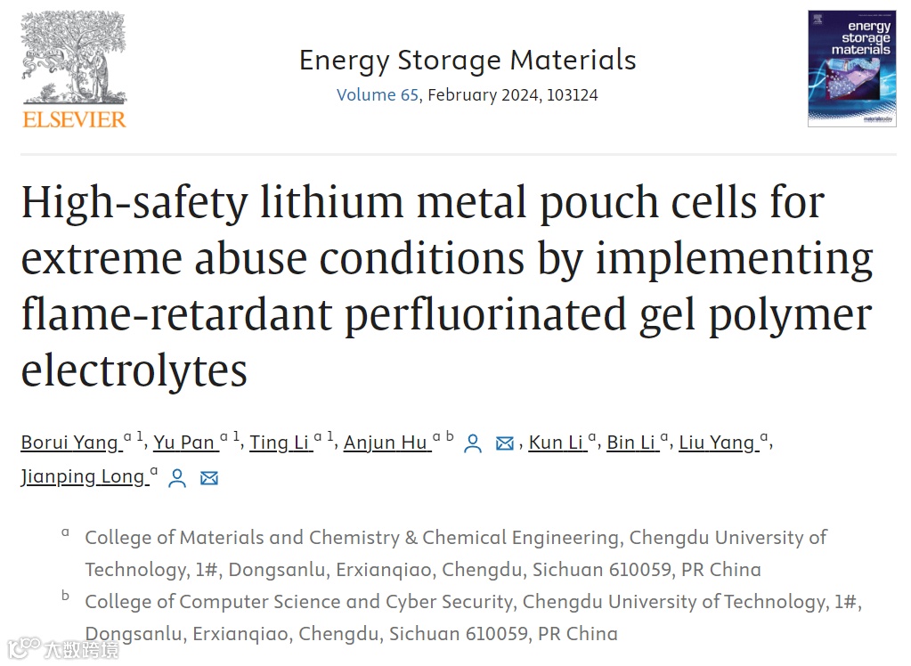 Borui Yang, Yu Pan, Ting Li, Anjun Hu, Kun Li, Bin Li, Liu Yang, Jianping Long, High-safety lithium metal pouch cells for extreme abuse conditions by implementing flame-retardant perfluorinated gel polymer electrolytes, Energy Storage Materials, 2024, 65, 103124.