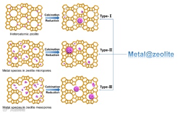 如图2所示,根据沸石孔道内金属物种的来源及位置,可以将沸石包覆金属催化剂划分为三种类型。第一种,金属原子以杂原子的形式存在于沸石骨架内,通过后续的焙烧或还原过程转移到沸石孔道中。第二种,金属物种本身无法进入沸石骨架(例如Pt, Pd或Ni)而存在于沸石微孔中,然后通过焙烧或还原成为封装的金属或金属氧化物。第三种,金属物种封装在沸石晶内介孔中。