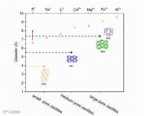 从广义上将沸石封装金属的合成策略分成后处理法(离子交换法、转晶法、再结晶法等)和原位合成法(原位水热、干胶合成法等)。如图3,金属前驱体(一般为水合金属粒子)直径往往大于中孔和小孔沸石的孔径,因此,后处理法难以将金属前驱体引入到沸石微孔中。原位合成法是在合成体系中引入金属前驱体,在沸石结晶过程中,金属离子可以作为阳离子起到稳定沸石骨架的作用,进而实现金属离子在沸石微孔中的原位包覆。