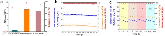 丙烯是最重要的工业原料之一,主要通过催化裂化和石脑油裂化两大工艺生产。自页岩气商业开发以来,丙烷脱氢技术逐渐成为丙烯生产的重要补充来源。全硅沸石分子筛(如Silicate-1, S-1)包覆金属催化剂被广泛用于催化丙烷脱氢反应,并表现出高的丙烯选择性和长周期稳定性。如图7所示,0.3Pt0.5Zn@S-1催化剂在450℃时丙烯选择性高达99%,TOF值为74.7 min-1。另外,由于沸石孔道的约束作用,0.3Pt0.5Zn@S-1催化剂表现出优异的稳定性。反应60 h后,0.3Pt0.5Zn@S-1失活不明显,失活速率为0.002 h-1,比0.3Pt0.5Zn/S-1失活速率低7.5倍。此外,0.3Pt0.5Zn@S-1催化剂具有很好的循环稳定性,四次循环后催化剂的活性与新鲜催化剂的活性几乎相同。