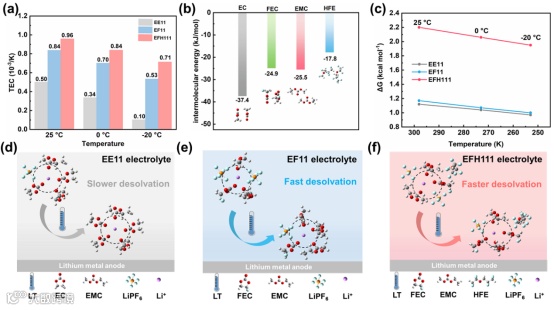 当温度降低的时候,所有分子的动力学变得缓慢,分子摆脱分子间相互作用变得更困难,这在宏观上表现为体积的收缩。如果体积被压缩到更大程度,则进一步压缩变得更加困难。热膨胀系数(TEC)指的是在一定温度下每1°c变化的体积变化量,可用于描述电解液中各种组分之间的疏松程度。较高的TEC表明电解质易受压缩,表明组分之间的相互作用距离较长。相反,较低的TEC表示具有相对更紧密的相互作用的更紧凑的状态。EE11电解液在不同温度下都表现出较低的TEC,说明在EE11中,分子之间的相互作用较强;而在EF11和EFH111电解液中,因为FEC分子和HFE分子相互作用较弱,所以表现出较高的TEC(图3a)。这与图3b中计算出的溶剂分子间结合能相符合。更进一步的,通过DFT计算溶剂分子在不同温度下取代三种电解质中溶剂化结构的阴离子的吉布斯能量也可以看出,在EFH111电解液中,溶剂分子要进入内层取代阴离子需要花费更大的能量,表明该电解液具有更好的温度适应性(图3c)。