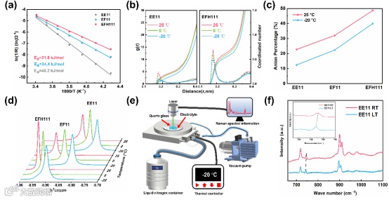 图2 (a)三种电解液的活化能。(b)不同温度的MD模拟结果。(c)电解液中的溶剂化结构比例变化。(d)变温核磁测试 (e)变温拉曼测试示意图 (f)变温拉曼测试