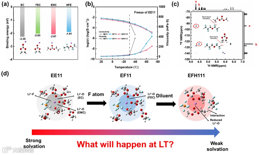 图1 (a)不同溶剂的结合能 (b)不同温度下电解液的粘度和电导率(c)EFH111电解液的二维核磁谱图 (d)三种电解液溶剂化结构示意图