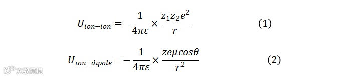 考虑到溶剂化结构是溶剂分子和阴离子相互竞争的结果,因此有必要将这两种相互作用力进行对比。根据经典物理学定律,溶剂-锂离子(离子-偶极作用,ion-dipole)和阴离子-锂离子(离子-离子作用,ion-ion)相互作用可以用下面公式表示: