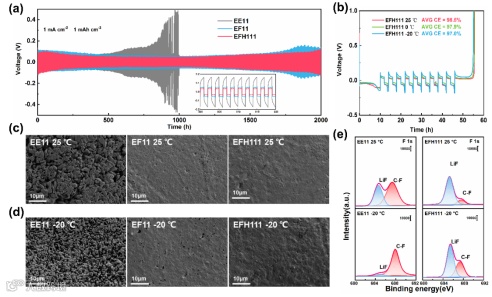 得益于富含阴离子的溶剂化结构和良好的温度适应性,EFH111在Li||Li电池能够稳定循环2000小时(图4a),并且在-20度下Li||Cu电池的平均库伦效率达到了97%(图4b)。从图4cd的SEM图可以看出,EE11电解液的锂沉积表面疏松多孔,低温下更加破碎,而XPS结果表明,EE11电解液表面有机溶剂分解成分占主导,这可以归因于EE11电解液在低温下溶剂化结构发生的变化。而EFH111的锂沉积形貌在低温下相对致密均一,并且XPS结果表明在低温下依旧是LiF主导,说明了其良好的温度适应性。