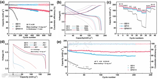 使用优化的EFH111电解液使得4.5V的Li||LCO电池在室温下以1C倍率循环700圈还有84.7%的容量保持率,即便在10C倍率下工作,也能有78.3%的容量保持。在低温性能方面,该电解液在-70度下的放电容量达到了129.3 mAh g-1,并且在-40度下以0.2C/0.5C倍率循环250圈后还有73.6%的容量保持率,展现出极佳的低温性能。