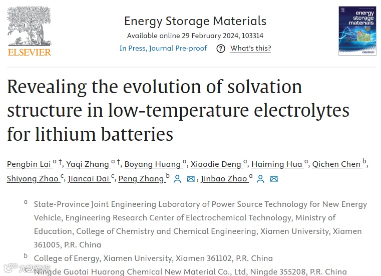 近日,来自厦门大学的张鹏教授/赵金保教授团队在国际知名期刊Energy Storage Materials上发表题为“Revealing the evolution of solvation structure in low-temperature electrolytes for lithium batteries”的文章。
