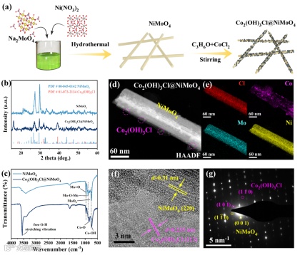 图1 Co2(OH)3Cl@NiMoO4的合成和表征。(a) Co2(OH)3Cl@NiMoO4的合成示意图。(b) Co2(OH)3Cl@NiMoO4的XRD结果和(c) FT-IR光谱。(d) Co2(OH)3Cl@NiMoO4的HAADF STEM和(e)相应的元素分布图像。(f) Co2(OH)3Cl@NiMoO4的高分辨率TEM图像和 (g) SAED标定图案。