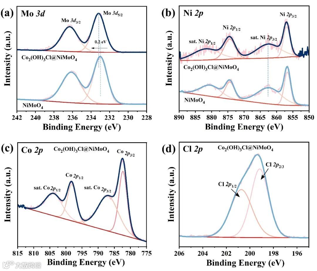 图2 Co2(OH)3Cl@NiMoO4和NiMoO4的XPS表征。(a) Co2(OH)3Cl@NiMoO4和NiMoO4中Mo 3d带的峰值。(b) Co2(OH)3Cl@NiMoO4和NiMoO4中Ni 2p带的峰值。(c) Co2(OH)3Cl@NiMoO4中Co 2p带的峰值。(d) Co2(OH)3Cl@NiMoO4中Cl 2p带的峰值。