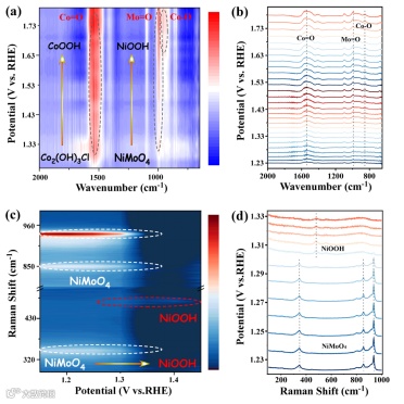 图4 Co2(OH)3Cl@NiMoO4的原位FT-IR和拉曼表征。(a, b) Co2(OH)3Cl@NiMoO4在1.0 M KOH中进行OER时原位FT-IR光谱图。(c, d) Co2(OH)3Cl@NiMoO4在1.0 M KOH中进行OER过程中未施加偏压的原位拉曼光谱图。