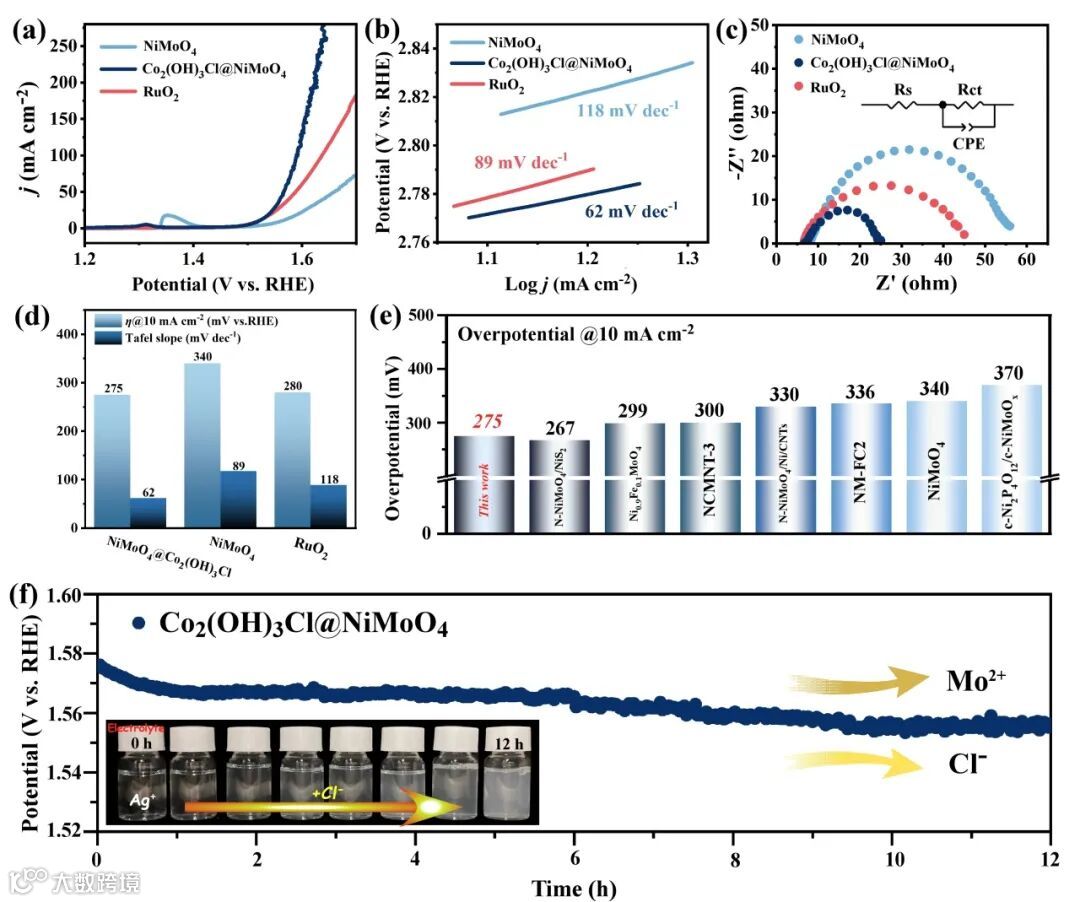 图3 Co2(OH)3Cl@NiMoO4的OER性能。(a) Co2(OH)3Cl@NiMoO4和NiMoO4的OER极化曲线和 (b)相应的Tafel图。(c) 在过电位为10 mV时的Co2(OH)3Cl@NiMoO4和NiMoO4的Nyquist图。(d) 不同电极的过电位和Tafel斜率性能对比柱状图。(e)基于NiMoO4NiMoO4的OER催化剂的过电位性能对比柱状图。(f) Co2(OH)3Cl@NiMoO4稳定性测试