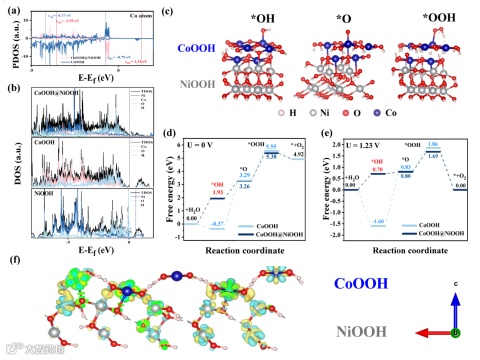 图5 CoOOH@NiOOH在OER过程中的DFT计算。(a) CoOOH@NiOOH、CoOOH和NiOOH的总电子态密度(TDOS)。(b) CoOOH@NiOOH表面上*OH、O*和*OOH在不同OER步骤中的吸附的原子结构。(c) 和 (d) CoOOH@NiOOH和CoOOH在OER不同步骤中计算的Gibbs自由能U = 0 (c) 和 U = 1.23 (d)的曲线。(f) CoOOH@NiOOH界面处的电荷密度差异,黄色和蓝色区域分别表示电荷的积聚或扩散。