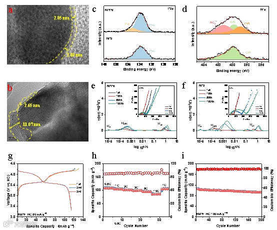 图5. a,b)在 NPP6 和 NP3 电解质中分别循环使用 NVPF 正极的 TEM 图。c,d) NVPF 正极在 NPP6 和 NP3 电解质中循环使用十次后的 P 2p 和 N 1s 曲线。