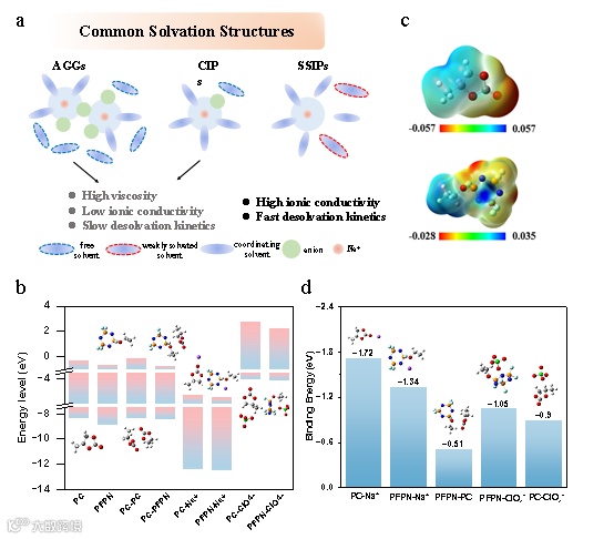 图1. 常见的溶解结构和不同成分的理论计算。a) 溶解结构示意图,重点是阳离子溶解环境。b) PC、PFPN、ClO4-、Na+-溶剂和ClO4-溶剂复合物的HOMO值和LUMO值;c) PC和PFPN分子的ESP;d) Na+、ClO4-、PC 和PFPN之间不同成分的结合能。