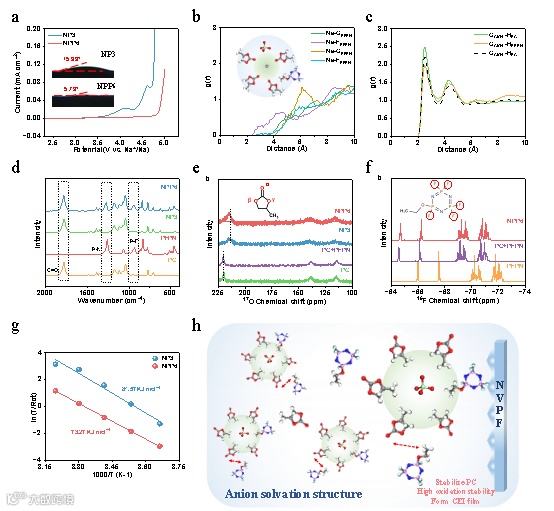 图2. 电解质的理化性质、MD 模拟和溶解结构。a) NP3和NPP6的LSV及插图中的润湿性质。各种电解质 d) 的傅立叶变换红外光谱(FTIR)从2000 cm到 400 cm-1。核磁共振(NMR)光谱 e) 各种溶剂中 C═O 的 17O 移位和 f) PFPN 的 P-F 的 19F 移位。