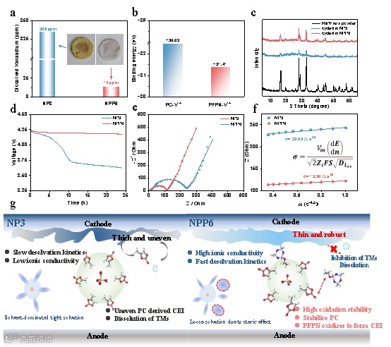 图4. a) 200 次循环后不同电解质中溶解钒离子的元素分析(插图为 GF 膜的照片)。b) PC、PFPN 和 V4+ 之间的结合能。c) 不同电解质中循环 NVPF 阴极和未加工 NVPF 材料的 XRD。d) NVPF||Na 在 4.3 V 下充电 24 小时后的静态放电曲线。