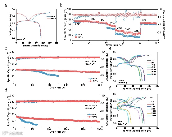 图3. a) NVPF||Na 与不同电解质的初始充放电曲线;b) 速率性能;c,d) 分别在 1 C 和 5 C 下的循环性能;e,f) NVPF||Na 与 NPP6 和 NP3 在 5 C 下不同循环的充放电曲线。