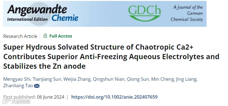 近日,南开大学陶占良团队在国际知名期刊Angew Chem上发表题为“Super Hydrous Solvated Structure of Chaotropic Ca2+ Contributes Superior Anti-Freezing Aqueous Electrolytes and Stabilizes the Zn anode”的研究文章。该研究文章提出了一种廉价高效的水系电解质,同时提高了低温性能和锌的稳定性,拓宽了防冻电解质的设计理念。