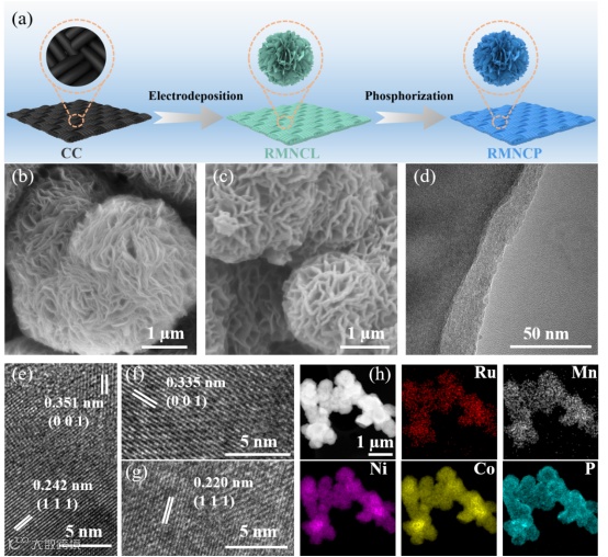 采用高效的一步电沉积法制备了RMNCL催化剂,用于析氧反应。将RMNCL进行低温磷化,得到RMNCP催化剂,用于析氢反应。所合成的催化剂展现出由纳米片组装而成的花状形貌,有利于暴露更多的活性位点,促进电催化反应高效进行。