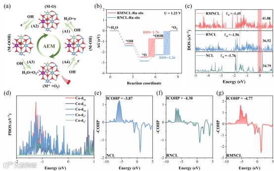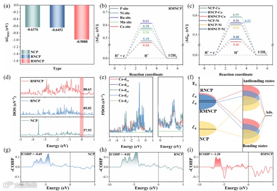 引入钌和锰后,催化剂的水分子吸附能、氢吸附能以及OER决速步骤能垒均得到优化。此外,评估吸附剂-金属相互作用的 d 带中心向费米能级靠近。这一变化表明,Ru 和 Mn 的引入引起了电子的重新分布,从而改变了 RMNCP 催化剂的电子结构,进而导致反键水平的提高,从而增加了对氢的吸附。此外,与 RNCP 相比,RMNCP 的 d 带中心后移,这表明 RMNCP 具有更出色的吸附和解吸能力。在负投影晶体轨道汉密尔顿群(-COHP)图中,纵轴上的负值和正值分别表示反键态和成键态。计算表明反应活化能降低,从而促进了化学反应,提高了催化剂的效率和选择性。值得注意的是,与 NCP 相比,RMNCP 的 ICOHP 值更低,这表明键合更有利。