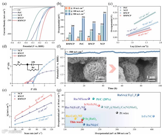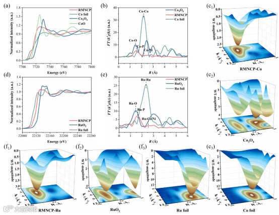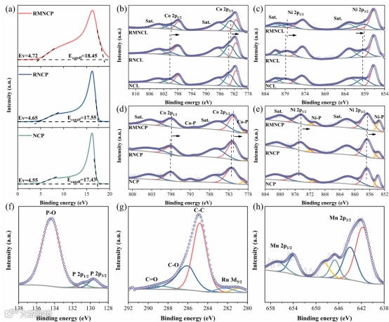 UPS图谱中,与 RNCP 和 NCP 相比,RMNCP 的低动能截止边 (Ecutoff) 分别增加了 0.9 和 1.02 eV。根据eΦ = hv - |Ecutoff - EF|,共掺杂导致催化剂的功函数降低。因此,电子从 RMNCP 内部迁移到表面的过程变得更加容易,从而促进了催化剂表面的电催化反应。在XPS图谱中,Ru-O-TM(TM= Ni、Co)和 Ru-OH-TM(TM= Ni、Co)桥梁的产生使得NCL 与 Ru 和 Mn 之间产生了强烈的电子相互作用,发生了局域电子转移。此外,RMNCP 中 Ru 的结合能超过了标准单原子 Ru 的结合能,表明 Ru(Ruδ+)的价态为轻微的正价态。轻微的正价态减弱了 H* 的吸附能,提高了催化剂的电催化性能。XAS图谱证实了Ru-P键的形成,表明Ru是高度分散的,为电化学反应提供了充足的活性位点。