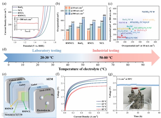 图5.催化剂在碱性电解液中的析氧活性以及AEM电解槽性能。