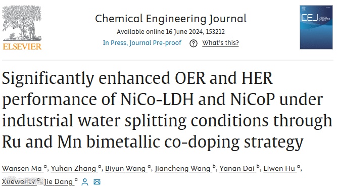 近日,来自重庆大学的党杰教授等人在国际知名期刊Chemical Engineering Journal上发表题为“Significantly Enhanced OER and HER Performance of NiCo-LDH and NiCoP under Industrial Water Splitting Conditions through Ru and Mn Bimetallic Co-doping Strategy”的观点文章。文章采用高效便捷的制备方法,制备了适用于工业条件(高温、大电流密度)的OER与HER催化剂。并揭示了共掺杂策略对催化剂电子填充的影响,为工业电解水制氢催化剂的开发提供了策略。