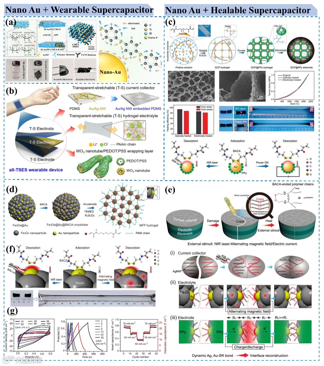 图4. 纳米金在可穿戴及可自愈超级电容器中的研究概况
