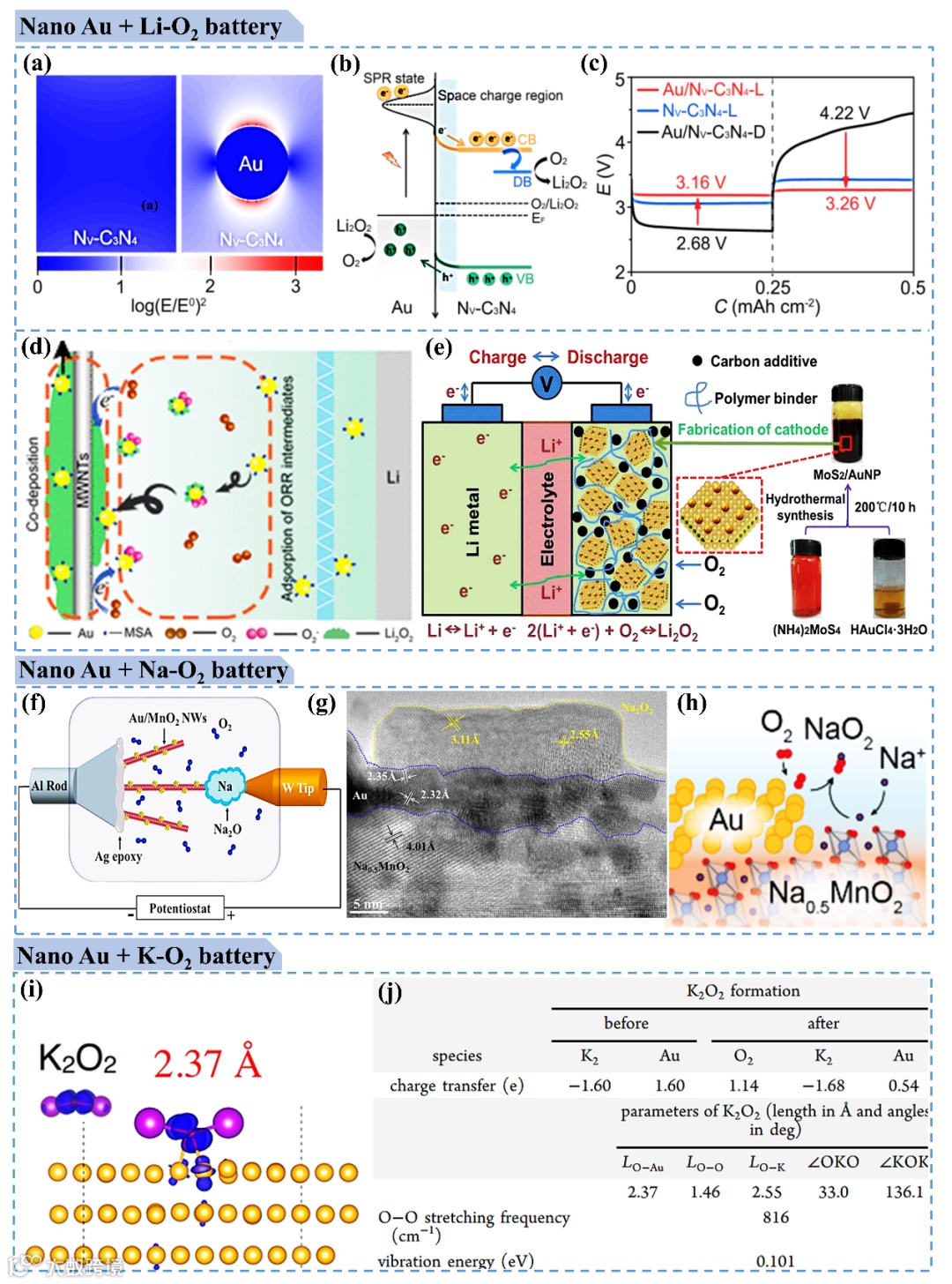 金属氧电池,特别是那些包含锂、钠的电池,在最近的研究中获得了极大的关注。与SCs、金属离子电池、金属硫化物电池相比、纳米金在金属氧电池中研究更加广泛和深入。已有研究结果表明: