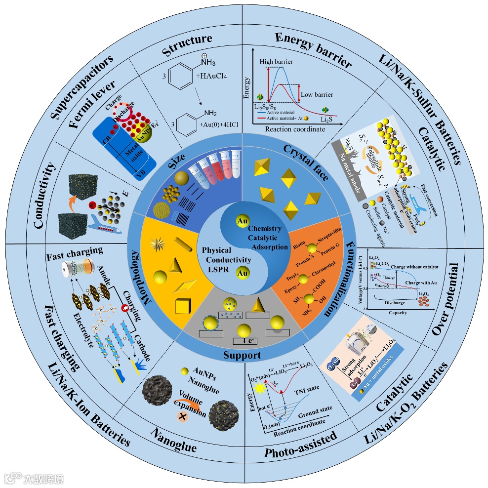 1.首次系统且全面的总结了纳米金在超级电容器、碱性金属离子电池、金属硫电池和金属氧电池中的潜在作用。
