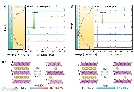 图5(a)NNMO和(b)NAF在1.5-4.5 V电压范围内的原位XRD图;(c)NNMO和NAF在充放电过程中结构变化示意图。