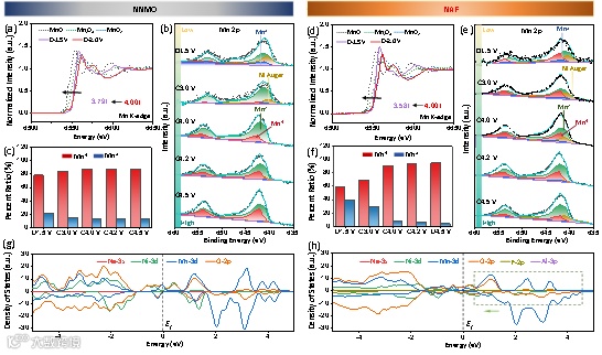 图4. Mn 2p在不同充放电状态下NNMO和NAF的(a, d)XANES和(b, e)XPS光谱测试图;(c, f)NNMO和NAF不同充放电状态下的Mn3+/Mn4+占比的XPS谱图拟合结果及(g, h)DOS计算结果图。