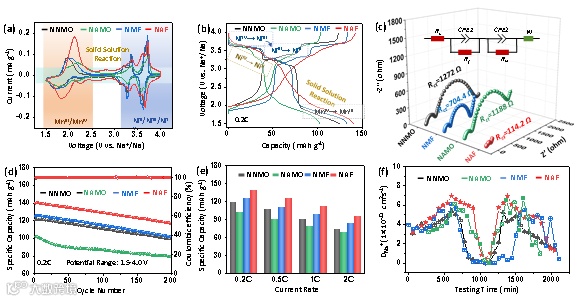 图3. 不同正极在1.5-4.0 V电压范围内的(a)CV曲线,(b)0.2C倍率下的恒流充放电曲线图,(c) EIS图及拟合数据,(d)长循环测试,(e)倍率测试及(f)运用GITT测试计算Na离子扩散系数(D+ Na)。