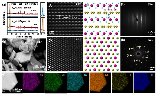 图2. 材料结构与形貌表征:(a) NNMO和NAF的Rietveld细化XRD谱图;(b) NAF的SEM图像,沿 (c-e) [010]和(f-h) [001]晶相的HAADF-STEM图像及晶体结构/SAED图;(i) NAF样品的HRTEM图像和EDS 元素mapping图。