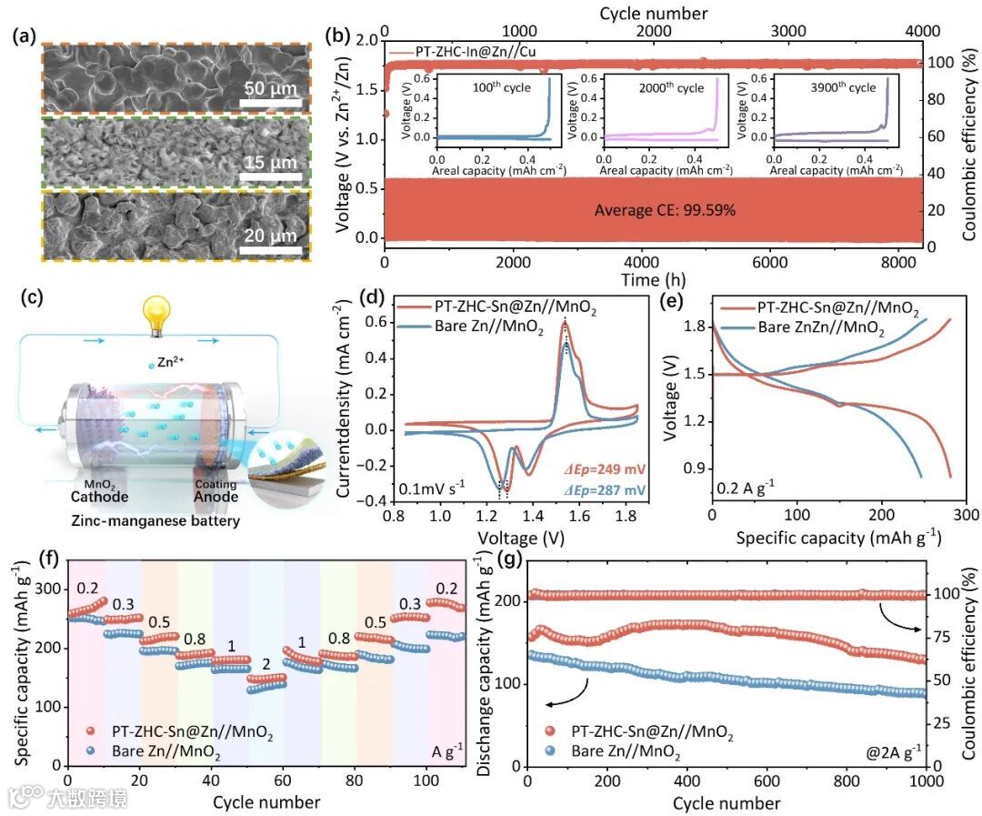 图5所示为梯度层策略的扩展和应用。合成三梯度层的策略具有过程简单、可控性好、易于扩展等特点。这种新的原位自重构策略可以推广到梯度PT-ZHC-In人工层的制备中(图5a)。在Zn//Cu电池体系中,PT-ZHC-In@Zn表现出超长循环寿命为8400 h (约350天) (图5b)。此外,PT-ZHC-Sn@Zn应用于Zn//MnO2全电池依旧表现出17.2%容量保持率的增加。
