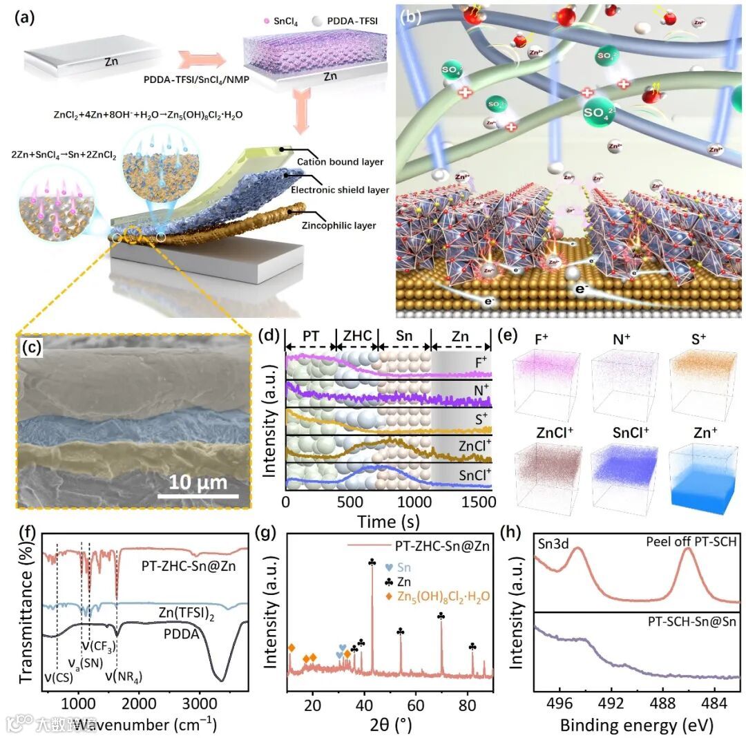 南京大学姚亚刚教授团队联合中科院苏州纳米所张其冲等人提出了一种一步原位自重构策略,在锌负极表面制备三重梯度人工层(PDDA-TFSI)-Zn5(OH)8Cl2H2O-Sn(PT-ZHC-Sn)。精心设计的三梯度人工层(PT-ZHC-Sn)包括具有阴离子限制和 H2O抑制作用的阳离子聚合物 PDDA-TFSI顶层、离子传导和电子屏蔽的 ZHC 纳米片中间层、亲锌的 Sn 金属底层。三梯度界面层协同作用,不仅抑制SO42-和H2O与负极的直接接触,还提供了Zn2+离子的快速传输通道,同时提供了丰富的成核位点,有效地防止了树枝状枝晶生长、HER 和副产物,从而赋予了锌金属负极出色的稳定性。