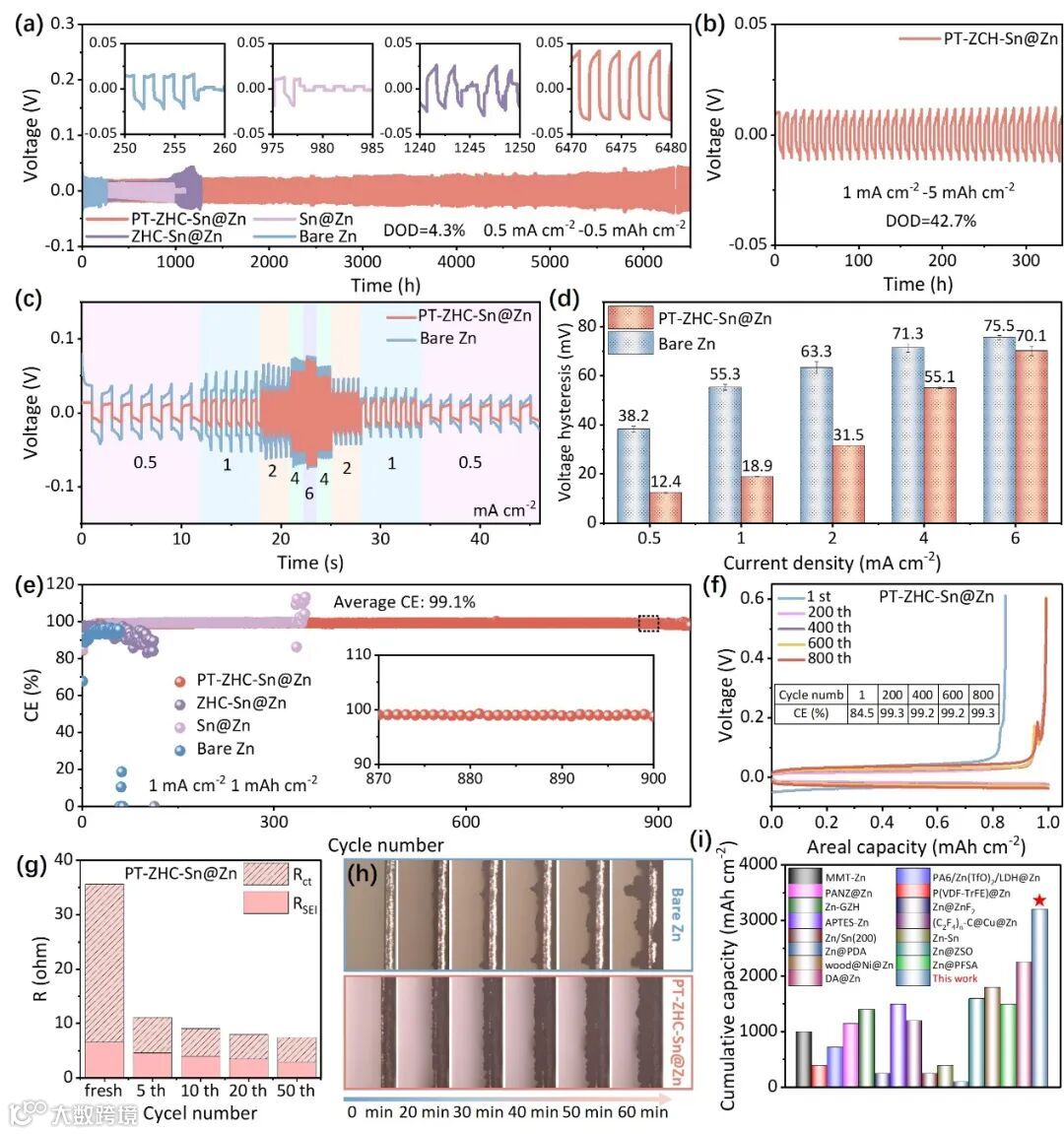 图4所示为PT-ZHC-Sn@Zn负极电化学性能表征。得益于三重梯度层的协同作用,PT-ZHC-Sn@Zn负极可稳定循环6500 h (约271天)。同时,在Zn//Cu电池中展现出较高的平均库伦效率(99.1%)。