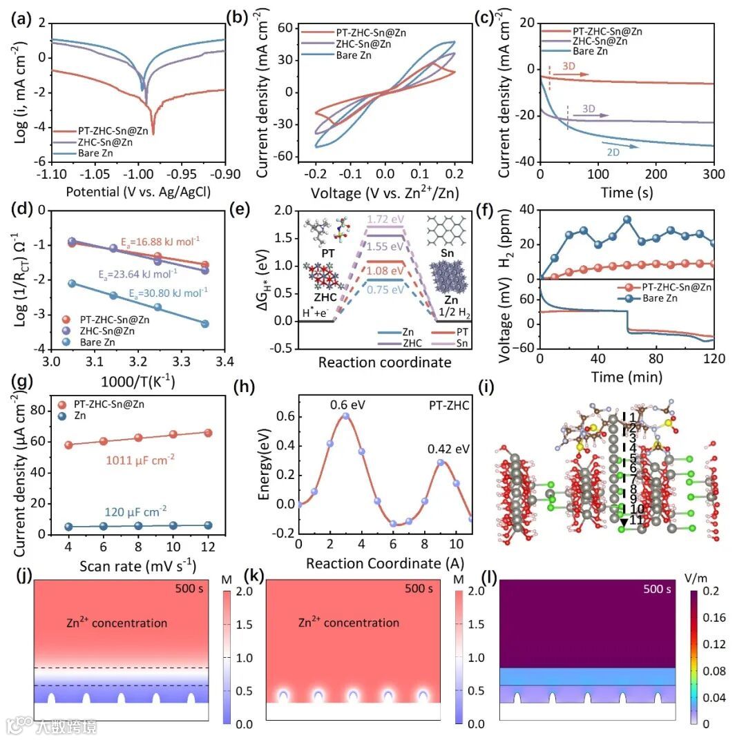 图3所示为PT-ZHC-Sn@Zn的动力学和析氢表征。PT-ZHC-Sn@Zn表现出了高的腐蚀电位和低的腐蚀电流,稳定的三维扩散,低的去溶剂化能垒以及较高的H*吉布斯自由能。