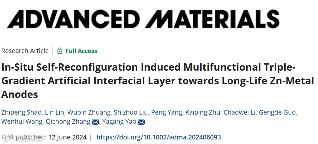 In-Situ Self-Reconfiguration Induced Multifunctional Triple-Gradient Artificial Interfacial Layer towards Long-Life Zn-Metal Anodes Zhipeng Shao, Lin Lin, Wubin Zhuang, Shizhuo Liu, Peng Yang, Kaiping Zhu, Chaowei Li, Gengde Guo, Wenhui Wang, Qichong Zhang*, Yagang Yao*
