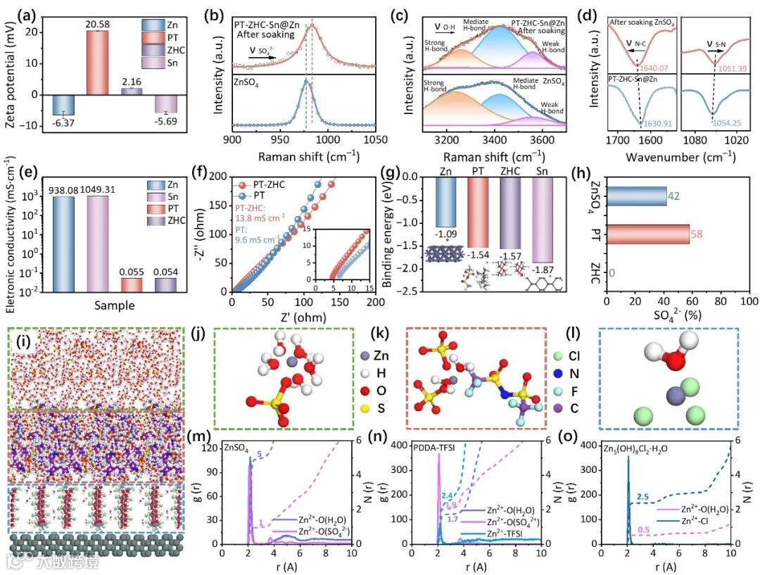 图2所示为三重梯度层PT-ZHC-Sn@Zn的作用机制。由于N+阳离子的作用,PT表层不仅固定了界面上的SO42-离子,促进了Zn2+离子的快速迁移,而且由于 TFSI- 中极性基团的存在,加速了Zn2+的脱溶过程。ZHC中间层是Zn2+离子传输的缓冲层,可促进Zn2+离子的快速迁移,同时防止电解质分解和 Zn 在界面上成核。作为底层,亲锌金属Sn为Zn2+离子沉积提供了更多的成核点,限制了Zn2+离子的二维扩散,并促进了均匀沉积。