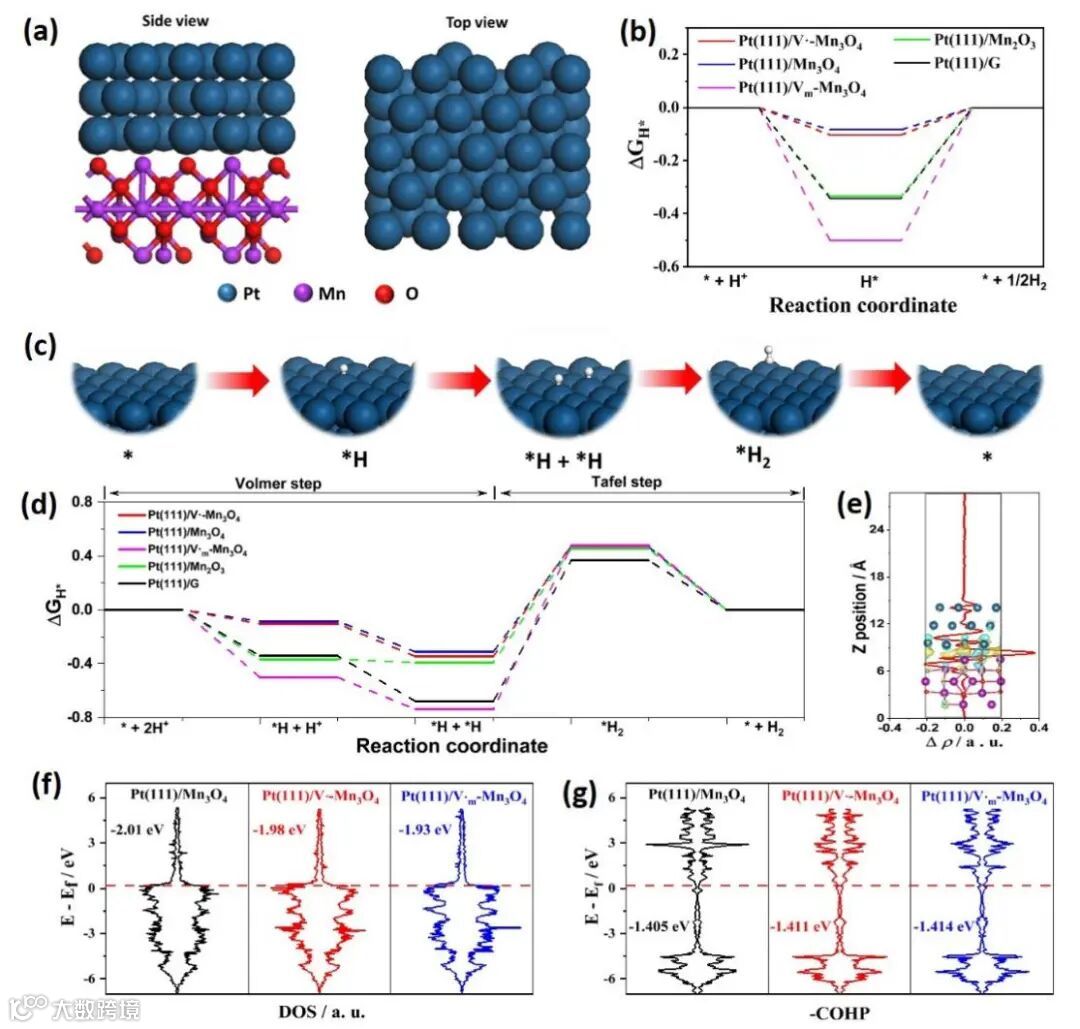 图2. DFT理论计算:(a) Pt(111)/V·-Mn3O4计算模型的俯视图和侧视图 (b) 氢在催化剂表面吸附的吉布斯自由能.按Volmer-Tafel机理的(c)氢原子在催化剂表面的吸附和(b)氢吸附吉布斯自由能. (e) Pt(111)/V·-Mn3O4的局域电荷积分. (f) Pt 4d带的 pDOS and (g) Pt(111)/Mn3O4, Pt(111)/V·-Mn3O4, and Pt(111)/V·m-Mn3O4催化剂表面Pt-H 的COHPs图。